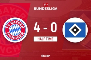 上半场比赛结束,拜仁慕尼黑4-0汉堡。