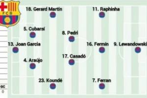 西班牙媒体《阿斯报》预测了巴萨此役的首发阵容,莱万、费兰-托雷斯、拉菲尼亚组成锋线三叉戟,卡萨多则在中场首发。