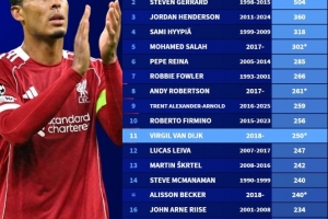 体育资讯12月14日讯 英超第16轮,利物浦在安菲尔德以2-0的比分战胜布莱顿。本场比赛,红军队长范戴克迎来代表球队的第150场英超出场,这让他足以位居队史第11位。