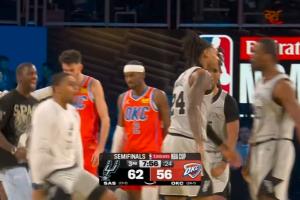 神仙手感!雷诺对抗被顶飞出底线 篮板后失衡超级高抛空心射进2+1