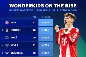 体育资讯1月4日讯 《转会市场》统计了2025年U21球员的身价上涨幅度情况,拜仁小将卡尔位居榜首。