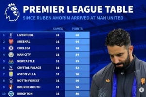 德转列自阿莫林执教曼联以来各队在英超取得的积分情况,阿莫林带队31轮仅取得31分,仅高于上赛季三支英超降级队,距第1名31轮取得68分的利物浦相差37分。