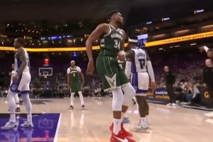 神仙手感!雷诺对抗被顶飞出底线 篮板后失衡超级高抛空心射进2+1