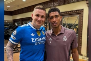 一位来自波兰的皇马球迷与贝林厄姆合影,并展示腿上的贝林厄姆头像文身,贝林厄姆社媒转发了合照。