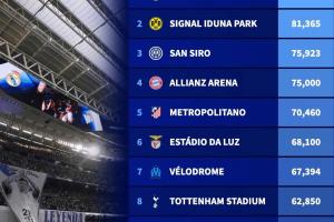 体育资讯9月18日讯 新赛季欧冠已经重燃战火,欧足联官方盘点了参赛36队10大容量最大球场,伯纳乌83186人居首。