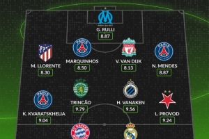 后卫:略伦特(马竞,8.30分)、马尔基尼奥斯(巴黎,8.50分)、范迪克(利物浦,8.13分)、努诺-门德斯(巴黎,8.87分)