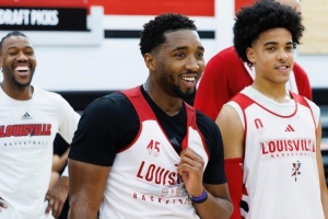 体育资讯9月21日讯 路易斯维尔大学篮球队社媒更新动态,晒出了一组校友米切尔和校篮球队队员们一同训练、打对抗赛的照片。