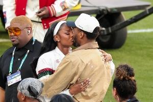 体育资讯02月09日讯 美国歌手兼演员Coco Jones为2026年超级碗献唱开场歌曲,未婚夫多诺万·米切尔全程陪伴支持并送出亲吻。