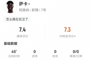 体育资讯2月16日讯 阿森纳在本轮足总杯4-0大胜维冈竞技,萨卡本场数据如下: