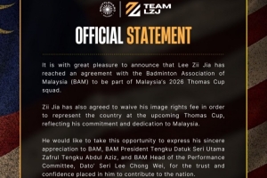 在此我们非常荣幸地宣布,李梓嘉和马来西亚羽毛球协会协商一致,将代表马来西亚羽毛球队出战2026年汤姆斯杯赛事。李梓嘉同意放弃肖像权费用,以促成代表马来西亚羽毛球队出战一事,此举也展现出他对马来西亚的承诺与奉献。