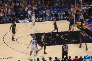 很是不解!湖人第三节最后一攻 詹姆斯接球冲筐被吹走步