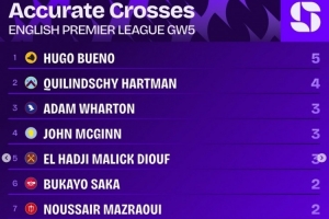 体育资讯9月24日讯 英超第5轮战罢,squawkafootball列各项数据排行,狼队后卫乌戈-布埃诺是精准传中次数最多的球员,共5次。