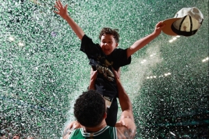 这个春天,杰森-塔图姆躺在波士顿郊外母亲家的沙发上,右腿上打着石膏。他看着7岁的儿子Deuce在iPad上回放篮球比赛的精彩瞬间。