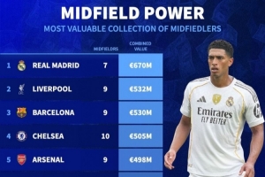 体育资讯9月25日讯 日前,德转统计了各队中场球员总身价排行,皇马7名中场总价6.7亿欧居首。