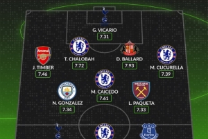 后卫:廷伯(阿森纳,7.46分)、查洛巴(切尔西,7.72分)、丹尼尔-巴拉德(桑德兰,7.93分)、库库雷利亚(切尔西,7.39分)