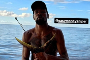 休赛期,杜兰特在巴哈马与新队友共度时光,加入了一次由史蒂文-亚当斯、杰肖恩-泰特和凯文-哈里斯组织的钓鱼之旅。