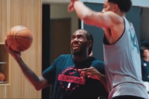 保罗、莱昂纳德、哈登、祖巴茨和比尔合体进行队内训练,莱昂纳德迎着防守强硬上篮打进。