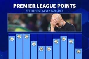 体育资讯10月6日讯 英超第7轮比赛,曼城客场1-0战胜布伦特福德。德国转会市场统计了瓜迪奥拉执教曼城赛季前7轮比赛的积分,本赛季13分创新低。
