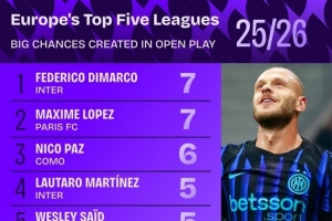 本赛季五大联赛运动战创造重大机会排名: