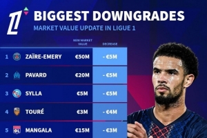 法甲球员身价下跌榜: