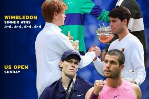 据统计,这是辛纳和阿尔卡拉斯连续三个大满贯决赛相遇。此外,这也是自公开赛以来首次有两位选手单赛季3次决赛相遇。