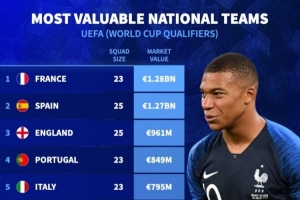 体育资讯9月6日讯 世欧预正在进行中,《转会市场》也统计了本期欧洲国家队阵容身价情况,法国力压西班牙居首。