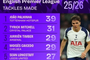 1.若昂-帕利尼亚,托特纳姆热刺,39次