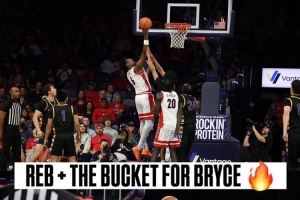 詹姆斯转发了亚利桑那大学男篮官方账号发布的他的小儿子布莱斯在比赛中完成补篮的照片,并配文道:“耶——6号!”