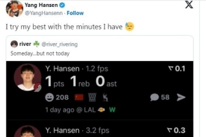 某网友在社媒发文表示赛季至今的5场比赛小杨得分依次是2分、2分、2分、1分、2分,并配文写道:“我知道他会打出来,但不是现在!”。假冒杨瀚森账号则在社媒上回复道:“我会在能获得的时间里用尽全力。”这一回复被“Sporting News”的编辑误以为是杨瀚森本尊于是他们撰写了新闻并发出(如下所示)。