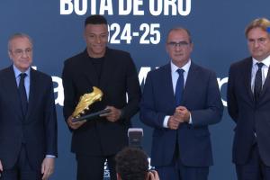 体育资讯10月31日讯 姆巴佩在伯纳乌球场贵宾室领取上赛季的欧洲金靴奖杯。这是姆巴佩生涯首次斩获欧洲金靴,也是乌戈-桑切斯和C罗之后的皇马第三人。