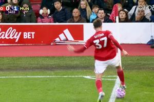但慢镜头显示,森林后卫控球未出界,主裁判仍然判给曼联角球。