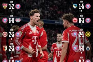 体育资讯11月02日讯 德甲第9轮,拜仁3-0大胜勒沃库森,新赛季15连胜,一共攻入54球。