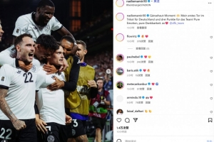 他也在赛后通过社媒晒出全队的庆祝照,并配文:“真是让人鸡皮疙瘩都起来了🙌我身披德国队战袍的首粒进球,为球队赢下了三分!无比激动,无比感恩。”