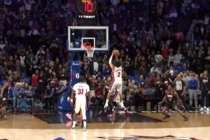 指哪儿打哪儿!詹姆斯三分线外灵犀一指 海斯起飞空接炸筐重扣