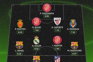 体育资讯11月10日讯 WhoScored列出了西甲第12轮最佳阵容,莱万、拉什福德、亚马尔、阿尔瓦雷斯、居莱尔在列。