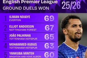 体育资讯11月11日讯 英超联赛已经进行了11轮,squakwa也统计了本赛季英超地面成功对抗次数,埃弗顿前锋恩迪亚耶居首。