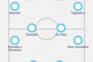 附《奥莱报》预测阿根廷队首发:大马丁;蒙铁尔、巴雷尔迪、奥塔门迪、塔利亚菲科;阿尔马达/小西蒙尼、帕雷德斯、德保罗、尼科-冈萨雷斯;阿尔马达/阿尔瓦雷斯、劳塔罗