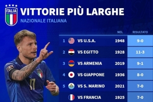 体育资讯11月14日讯 北京时间11月17日凌晨,意大利将在世预赛最后一轮比赛中主场对阵挪威,意大利此役需要至少净胜挪威9球,才能直接出线。德国转会市场列出了意大利队史最大比分胜利榜单。