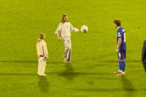 迎来40岁生日的莫德里奇本场比赛之后留在场上,与自己的两个女儿颠球互传,从视频中看,莫德里奇的大女儿颠球熟练。