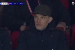 体育资讯11月27日讯 阿森纳vs拜仁第17分钟,转播镜头给到看台,英格兰主帅图赫尔在现场。