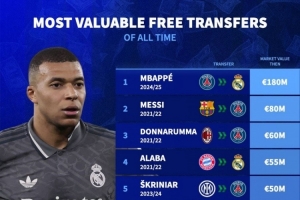 体育资讯11月29日讯 德国转会市场列出了自由转会球员身价排名,姆巴佩1.8亿欧居首,梅西8000万欧次席。