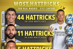 本世纪皇马球员戴帽次数排名: