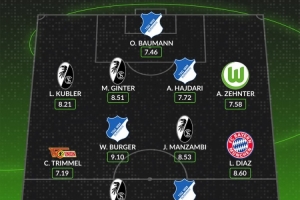 体育资讯12月1日讯 本轮德甲已经完赛,whoscored也统计了本轮德甲评分最佳阵容,霍芬海姆和弗赖堡各4将入围。