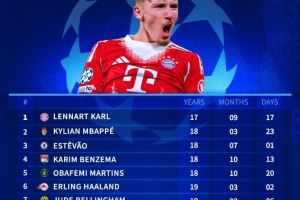 体育资讯12月10日讯 在本轮欧冠拜仁3-1击败葡体的比赛中,卡尔破门,也成为欧冠最年轻连续3场进球球员。以下为自92/93赛季欧冠改制以来最年轻连续3场破门纪录榜: