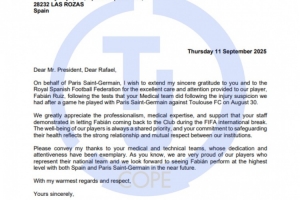 “我们非常感谢贵方团队在国际比赛日期间,让法比安顺利返回俱乐部所展现出的专业精神、医学专长以及大力支持。球员的健康始终是我们共同的优先事项,贵方在保障球员健康方面所做出的承诺,也体现了我们两家机构之间牢固的合作关系与相互尊重。”