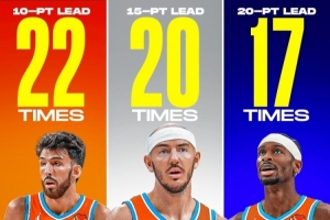 以24胜1负的战绩稳居联盟榜首,雷霆不仅仅是赢球,他们每晚都在以游戏般的分差碾压对手。