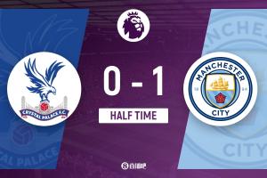 上半场伤停补时3分钟,半场结束,曼城暂1-0水晶宫。