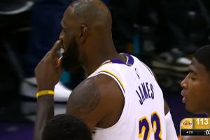 GIF-詹姆斯三分出手!裁判吹了太阳犯规!太阳挑战失败!