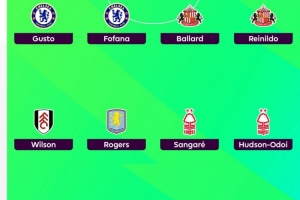 中场:威尔逊(富勒姆)、罗杰斯(维拉)、桑加雷(诺丁汉森林)、奥多伊(诺丁汉森林)