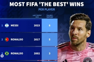 体育资讯12月17日讯 FIFA年度颁奖典礼结束,登贝莱获FIFA年度最佳球员。德转列FIFA年度最佳球员获奖次数,梅西8次最多,C罗第二,齐达内、罗纳尔多并列第三。